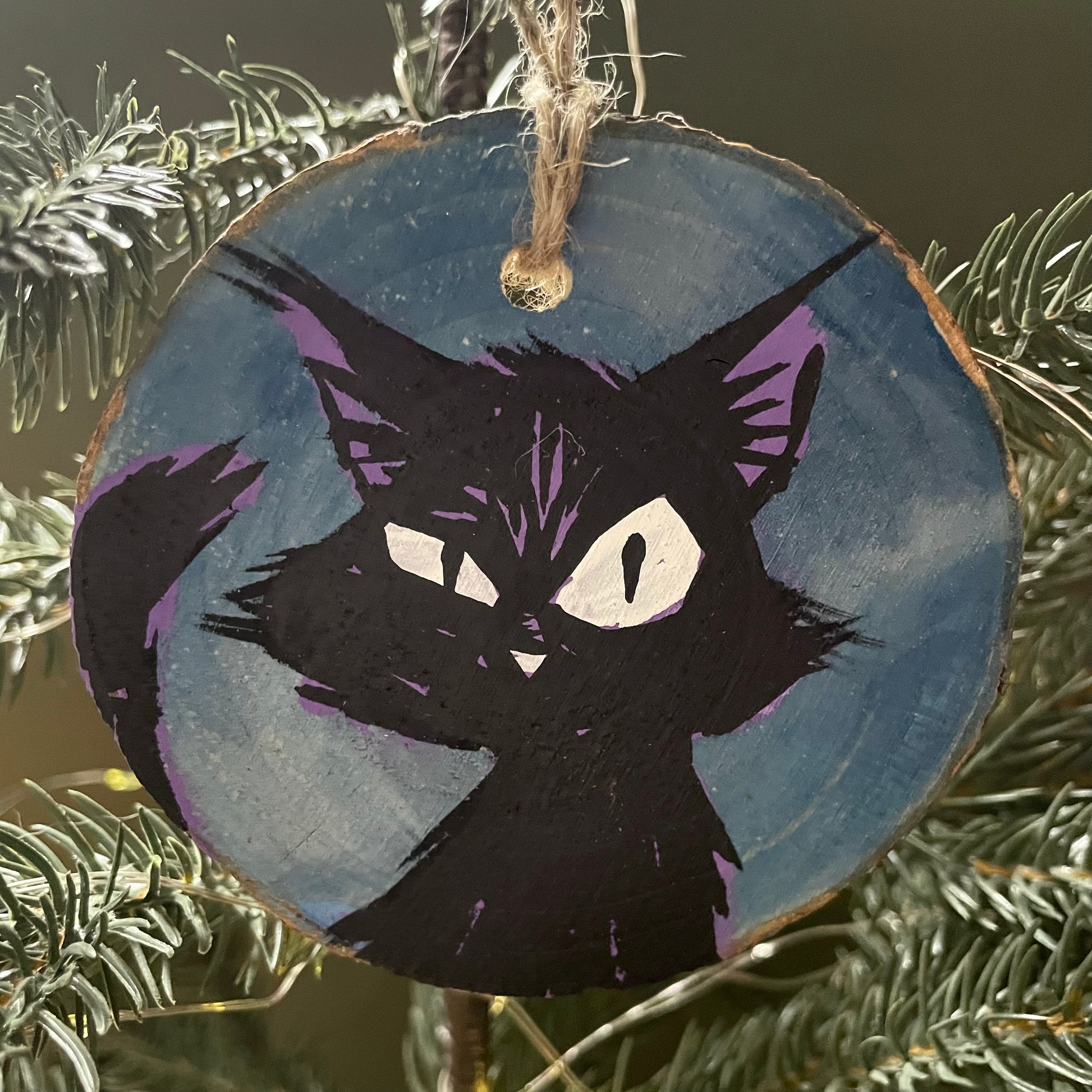 This spooky black cat ornament is a hand painted, one of a kind ornament. This image was made on a wooden ornament with acrylic paint and ink by Michael and will be the perfectly weird decoration for your tree.