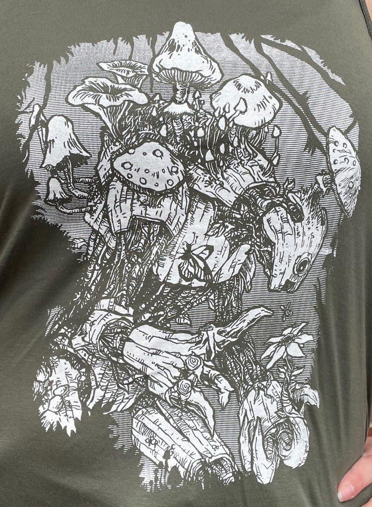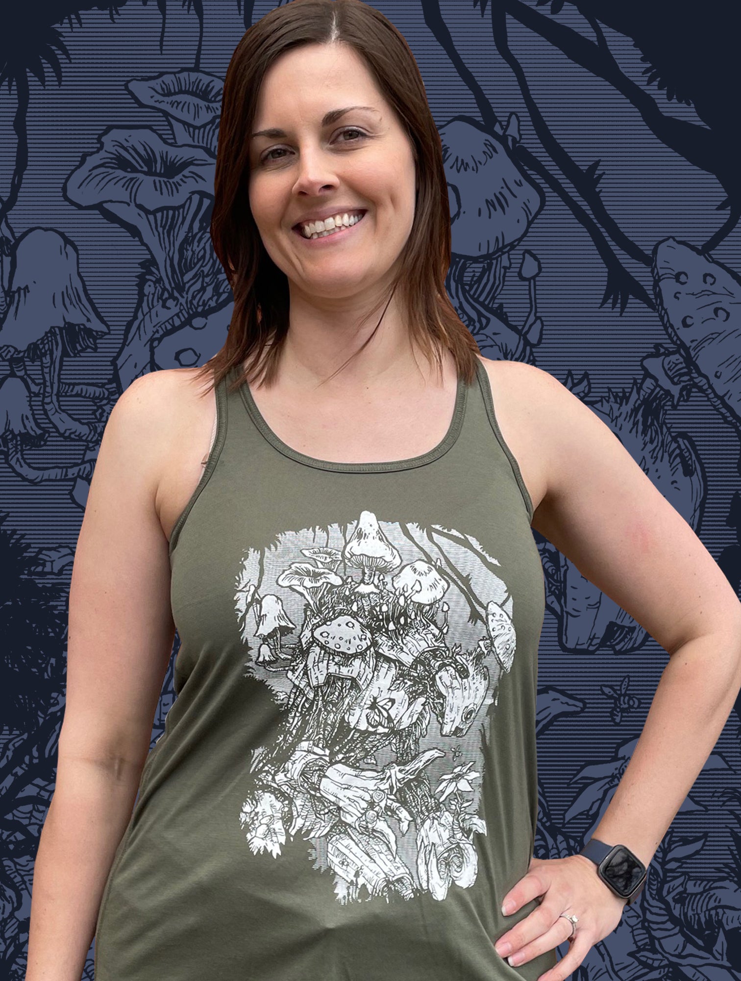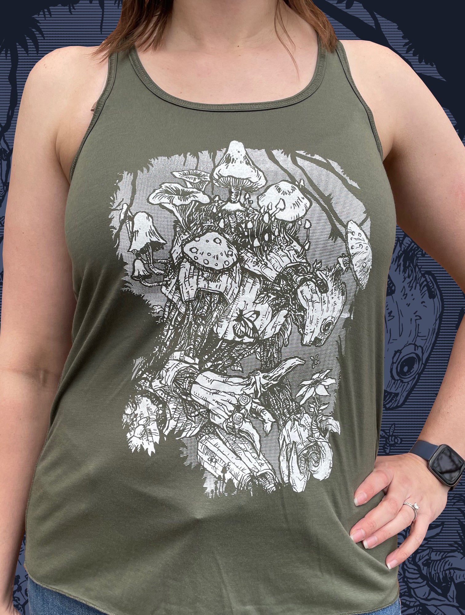 This is a screen printed shirt with WHITE ink on a MILITARY GREEN colored Flowy Racerback Tank (made by Bella + Canvas). All illustrations are original, come straight from my sketchbook, and are printed in the Spaghetti Kiss dungeon (my basement)!