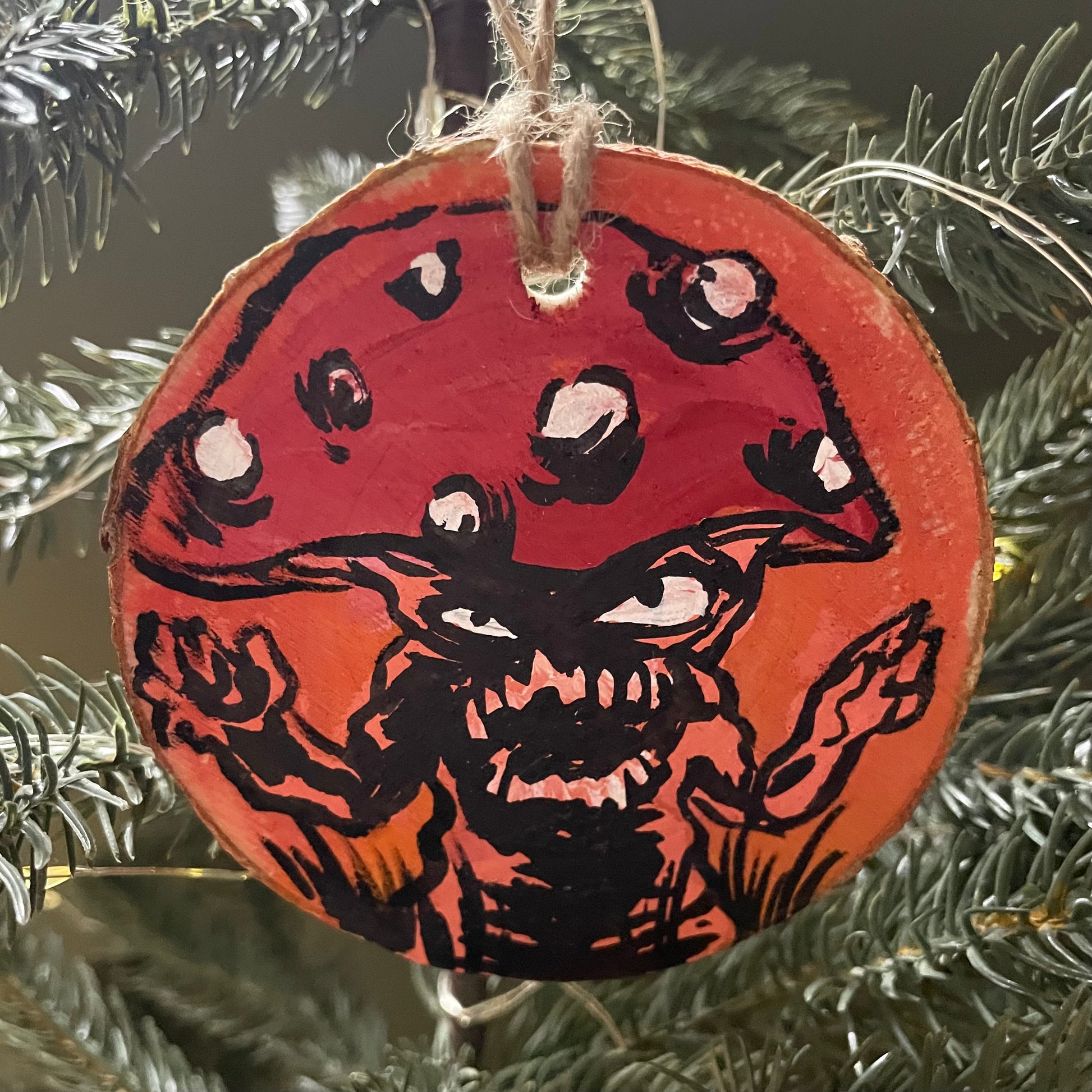 This creepy mushroom ornament is a hand painted, one of a kind ornament. This image was made on a wooden ornament with acrylic paint and ink by Michael and will be the perfectly weird decoration for your tree.