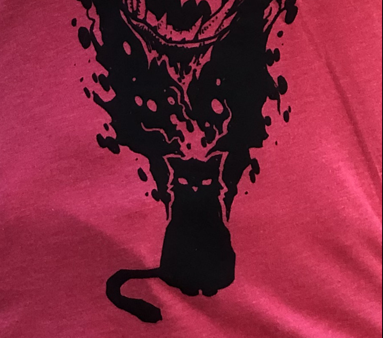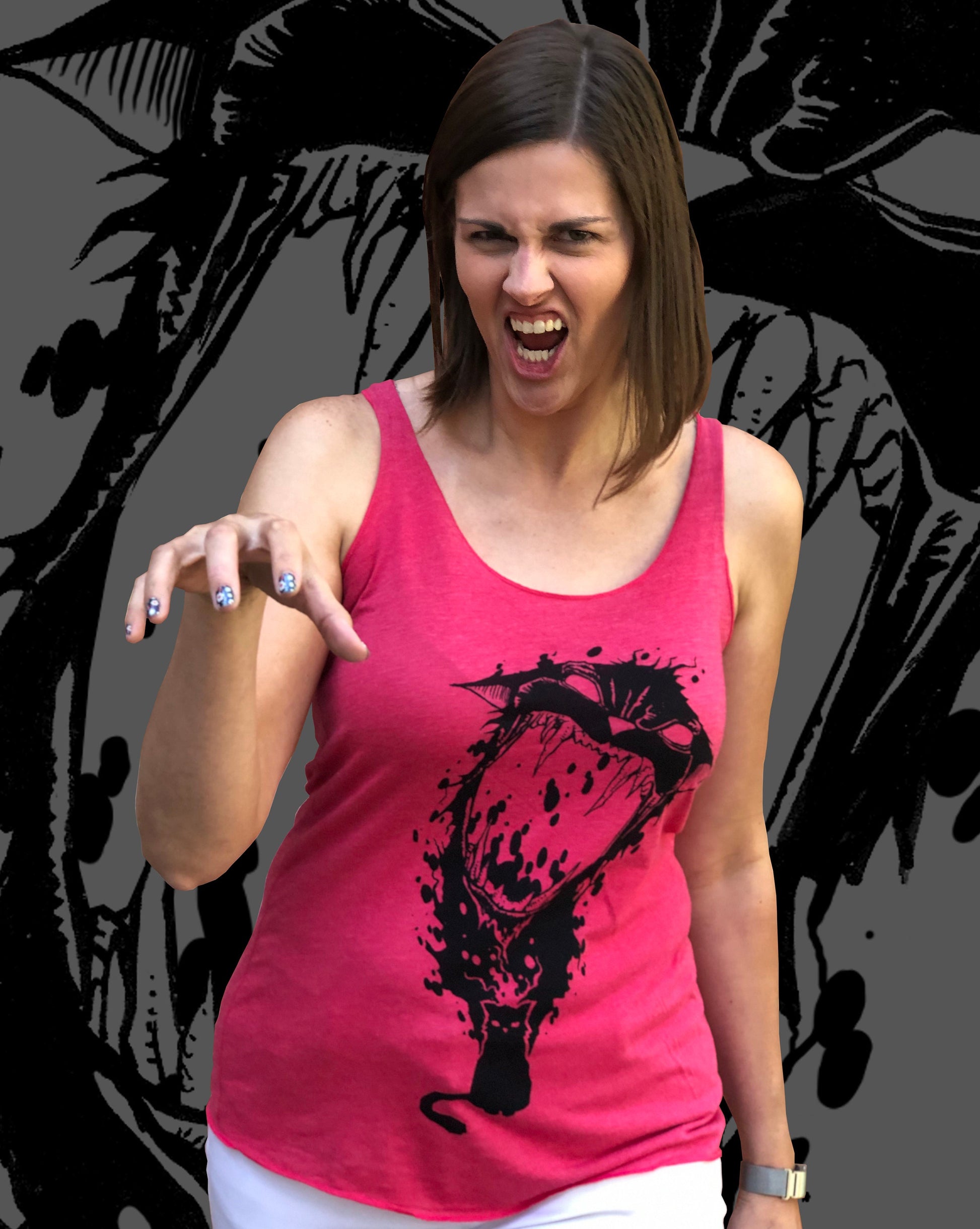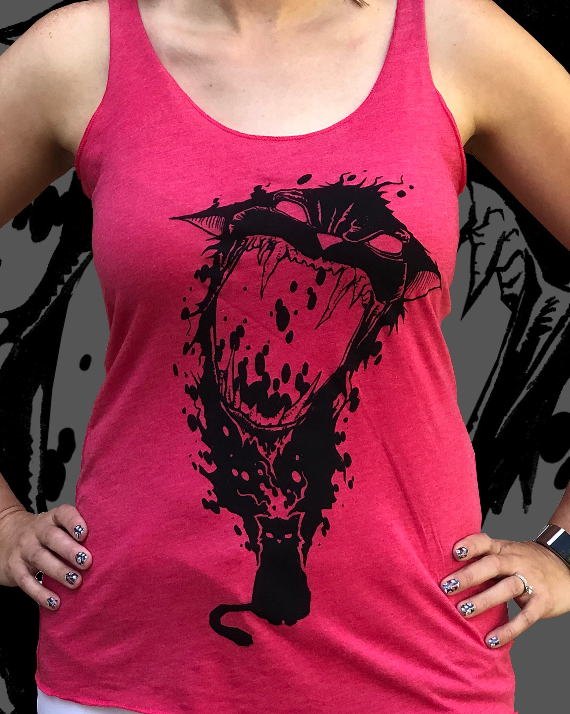 This is a screen printed shirt with BLACK ink on a VINTAGE PINK colored Racerback TANK (made by Next Level Apparel). All illustrations are original, come straight from my sketchbook, and are printed in the Spaghetti Kiss dungeon (my basement)!