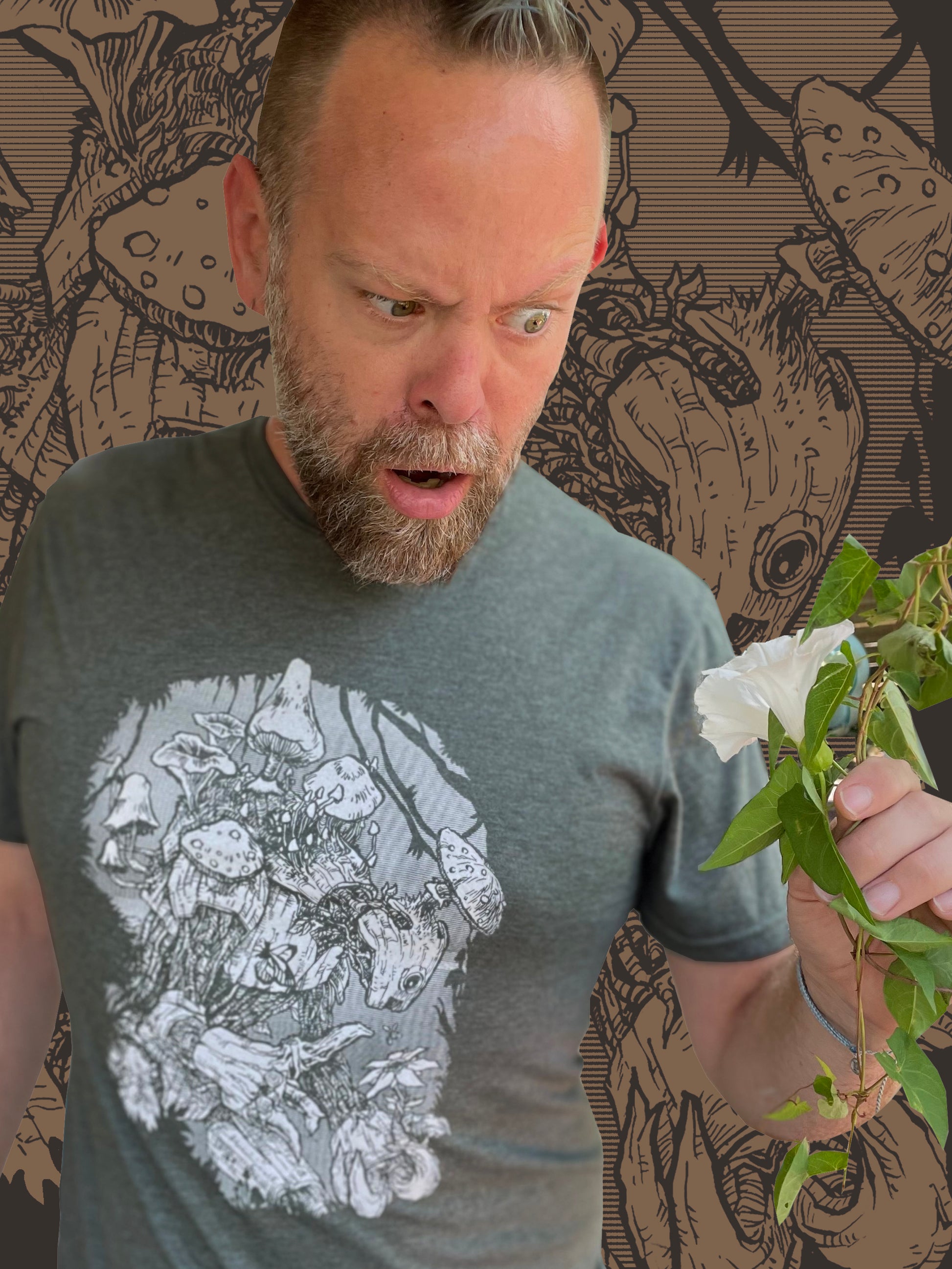 This is a screen printed shirt with WHITE ink on a HEATHER MILITARY GREEN Gildan SOFTSTYLE tee. All illustrations are original, come straight from my sketchbook, and are printed in the Spaghetti Kiss dungeon (my basement)!