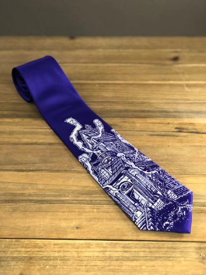 This is a screen printed TIE with WHITE ink on a PURPLE tie. The tie is a standard size. All illustrations are original, come straight from my sketchbook, and are printed in the Spaghetti Kiss dungeon (my basement)!
