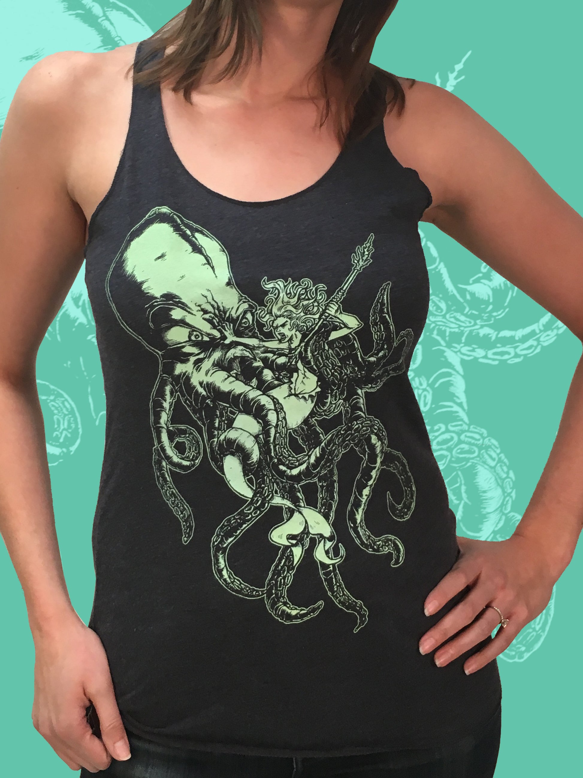 This is a screen printed shirt with MINT ink on a VINTAGE NAVY colored Racerback TANK (made by Next Level Apparel). All illustrations are original, come straight from my sketchbook, and are printed in the Spaghetti Kiss dungeon (my basement)!
