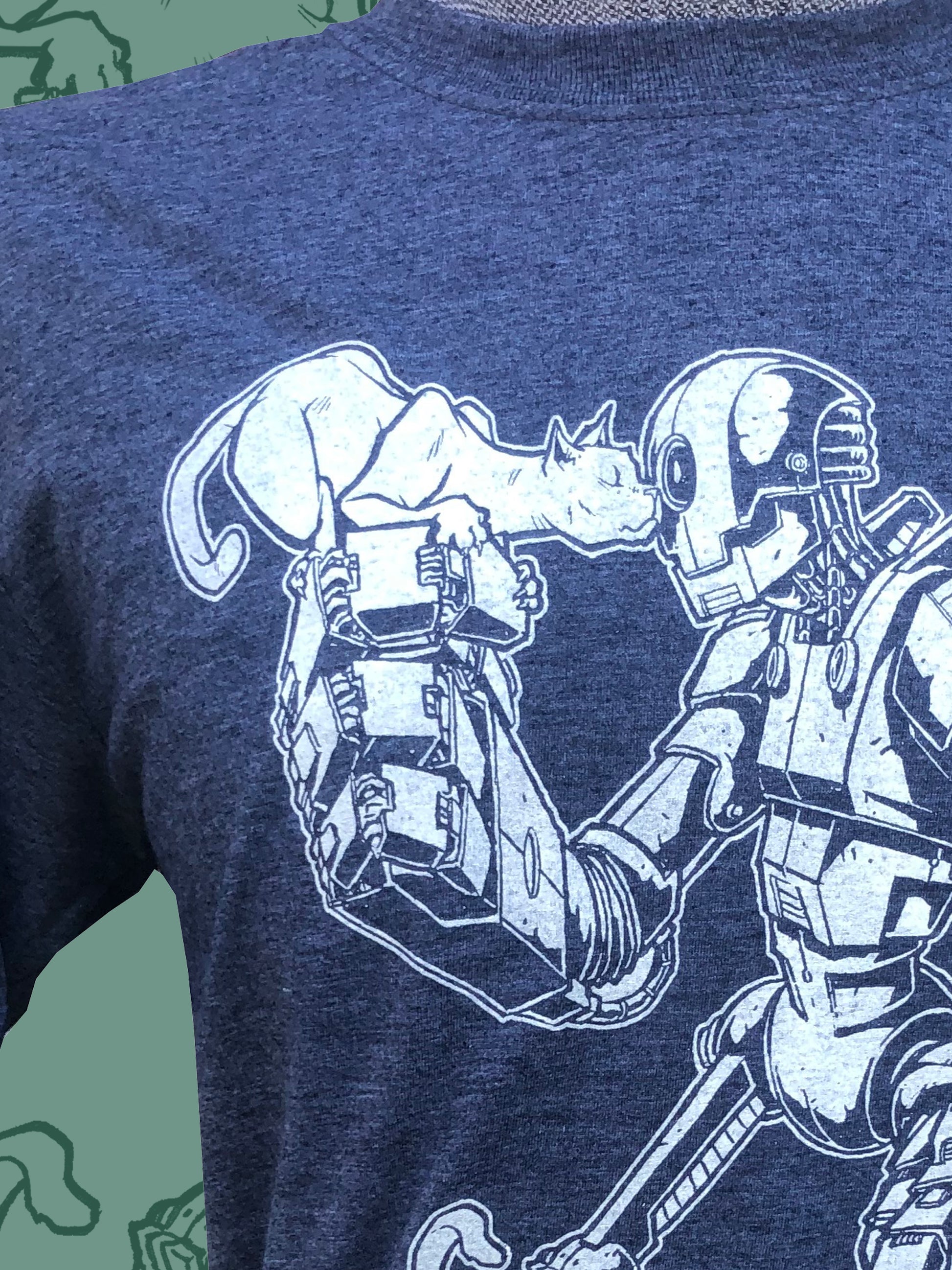 This is a screen printed shirt with WHITE ink on a HEATHER NAVY Gildan SOFTSTYLE tee. All illustrations are original, come straight from my sketchbook, and are printed in the Spaghetti Kiss dungeon (my basement)!