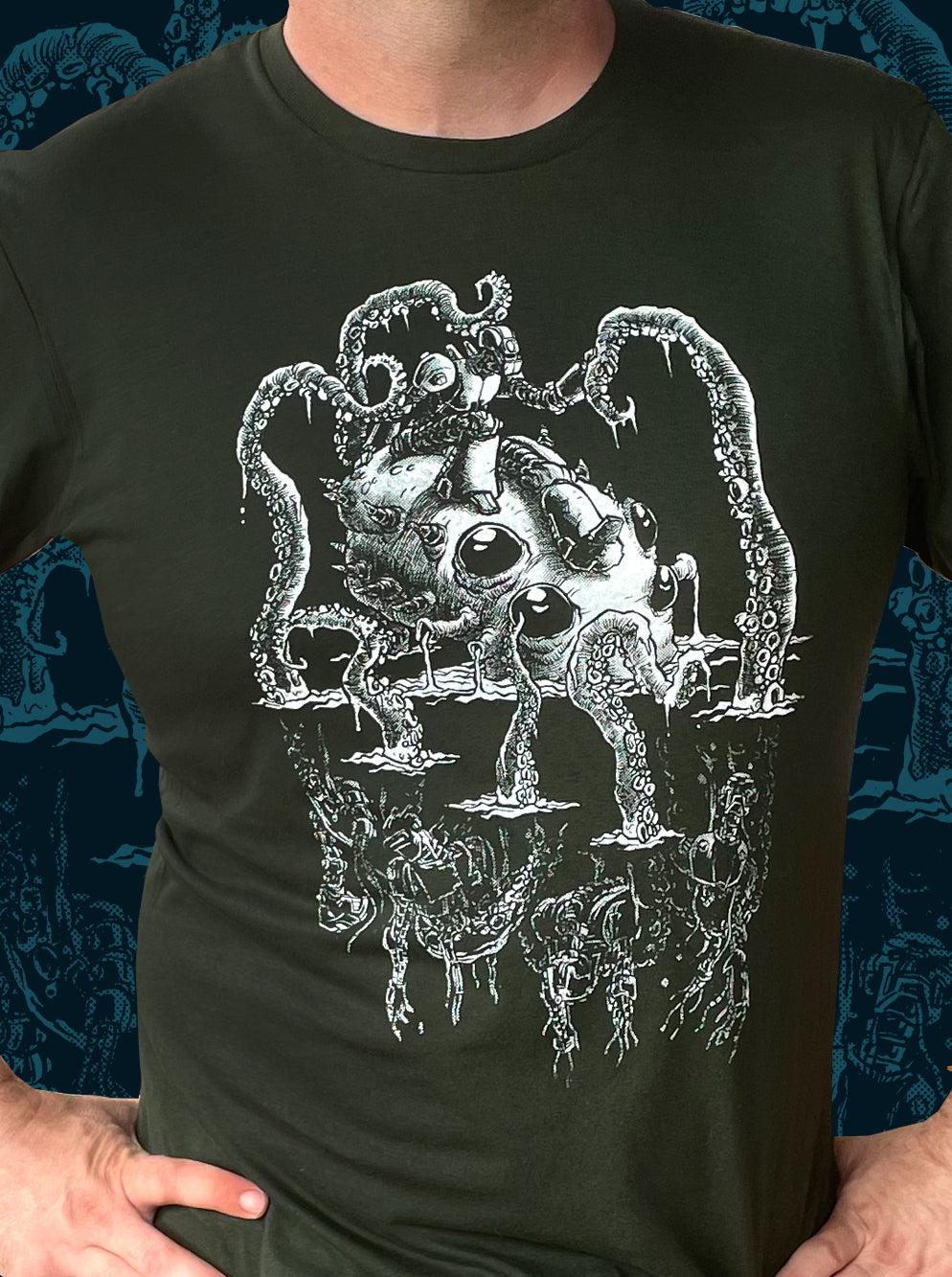 This is a screen printed shirt with WHITE ink on a FOREST GREEN Gildan SOFTSTYLE tee. All illustrations are original, come straight from my sketchbook, and are printed in the Spaghetti Kiss dungeon (my basement)!