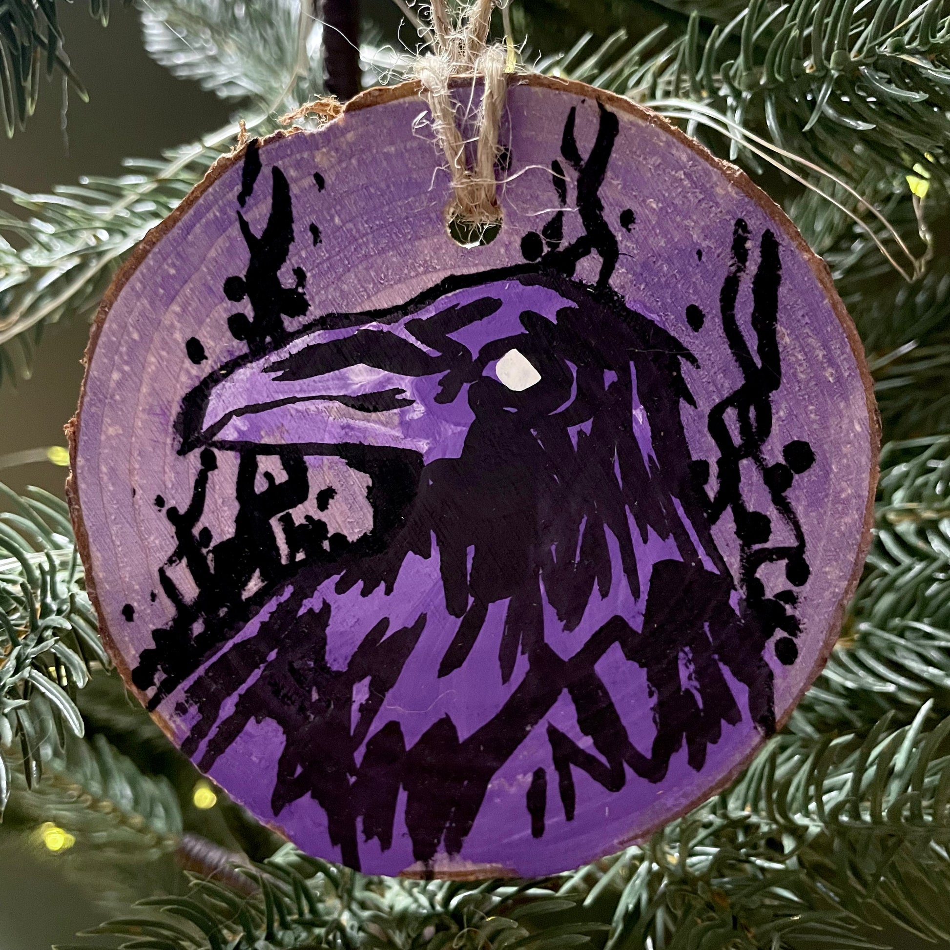 This spooky raven ornament is a hand painted, one of a kind ornament. This image was made on a wooden ornament with acrylic paint and ink by Michael and will be the perfectly weird decoration for your tree.