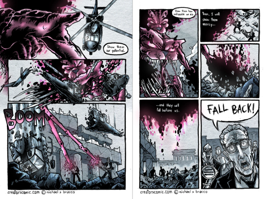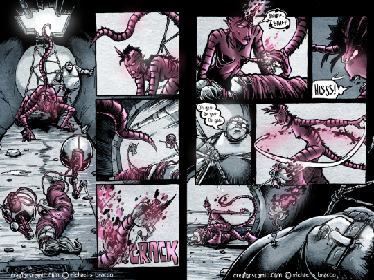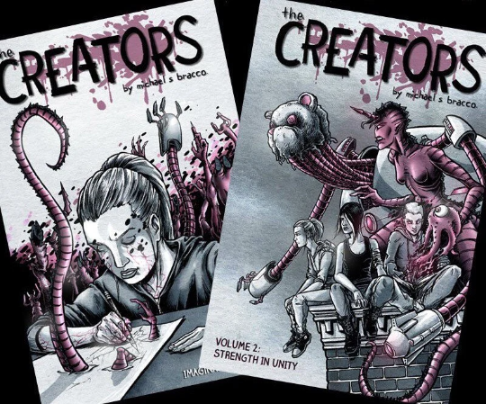 "Bracco's writing in The Creators is well done, dense but easy to read, but the art is where the book really shines...Creativity drips from each panel...and you're excited to see what will show up next. It's punctuated by "down to earth" images of real people, providing an emotional base for the plot. The colors are cool, a lot of grays and blacks but the things that need to stand out - the monsters and the blood - are colored violent reddish hues. The juxtaposition works fantastically and makes each panel pop."